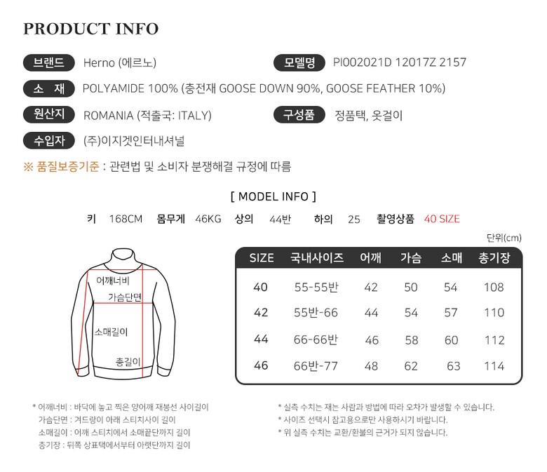 | 1. 제품 소재 (섬유의 조성 또는 혼용률을 백분율로 표시, 기능성인 경우 성적서 또는 허가서) | 상세페이지 참조 |