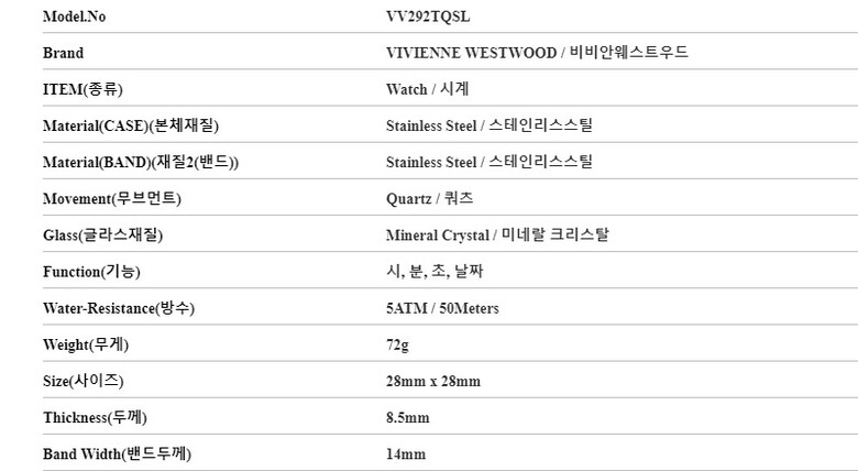 * 상품 옵션(사이즈) : 모델명:VV292TQSL *