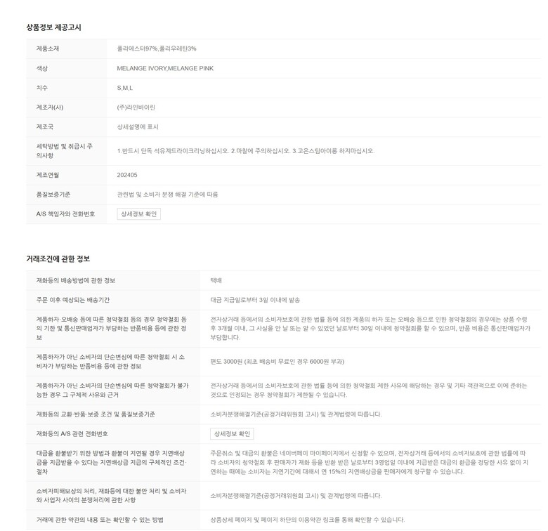| 6. 세탁방법 및 취급시 주의사항 | 상품상세참조 |
