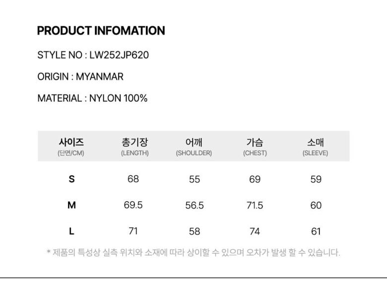 | 1. 제품 소재 (섬유의 조성 또는 혼용률을 백분율로 표시, 기능성인 경우 성적서 또는 허가서) | 겉감:나일론 100% |