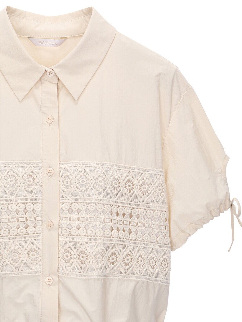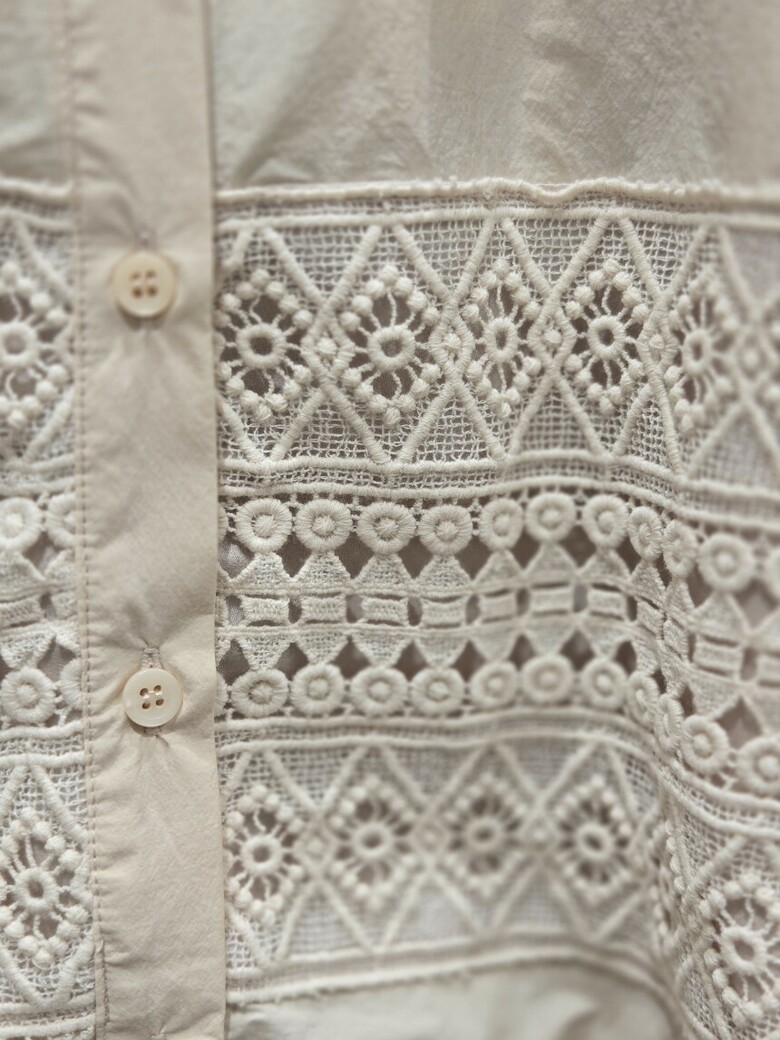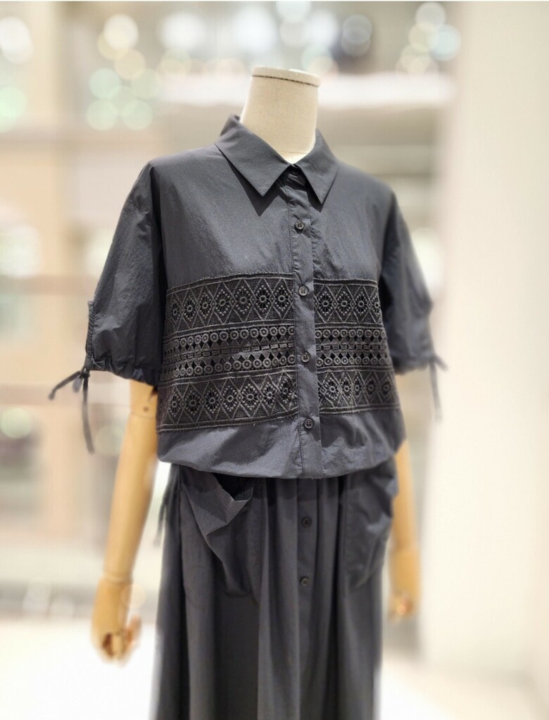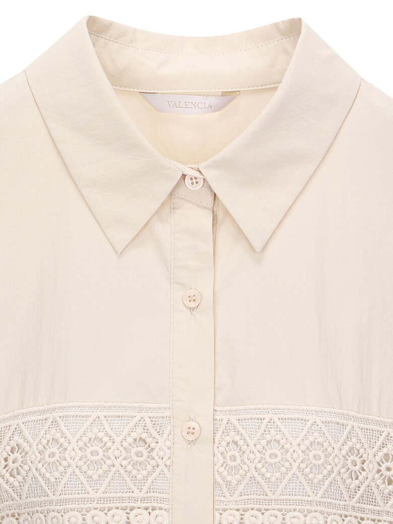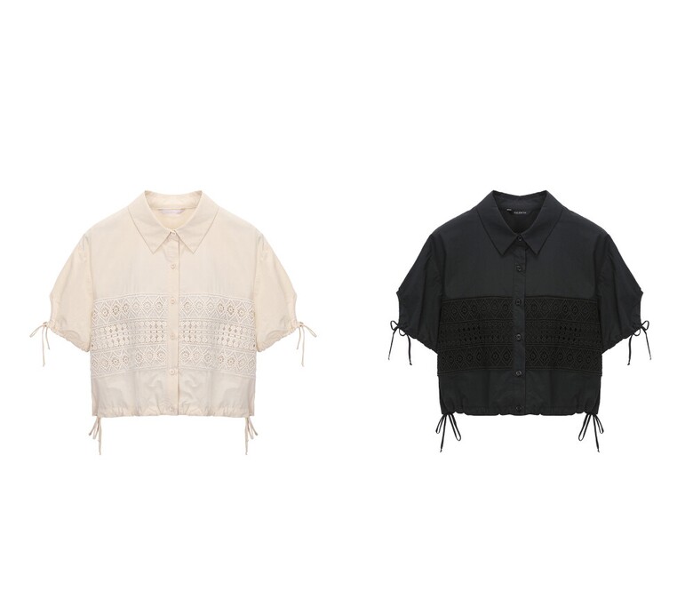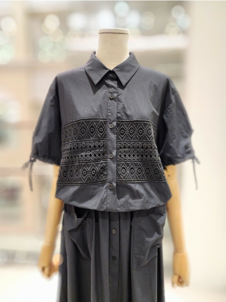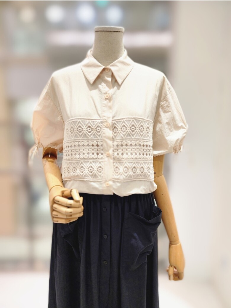 앞면펀칭 레이스포인트로 스커트 셋트로나온 여성스런 블라우스입니다.