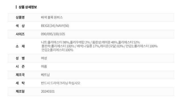 | 6. 세탁방법 및 취급시 주의사항 | 상품상세참조 |