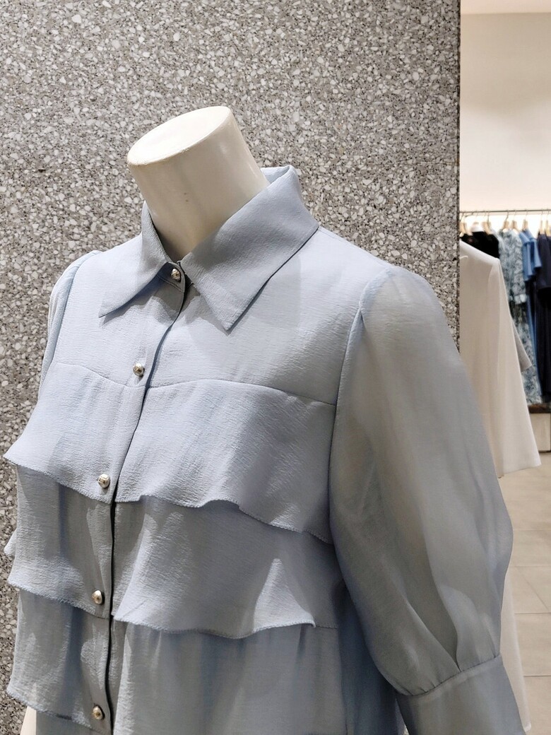 네크 칼라 넥 라인에 프런트 티어드 러플 디테일로