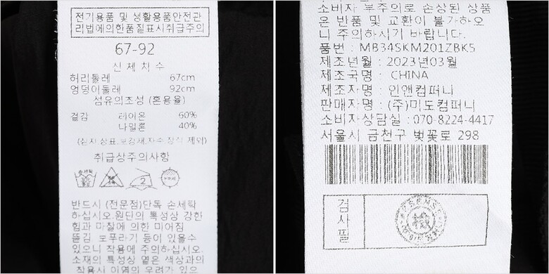 | 1. 제품 소재 (섬유의 조성 또는 혼용률을 백분율로 표시, 기능성인 경우 성적서 또는 허가서) | 겉감-나일론40% 레이온60% |
