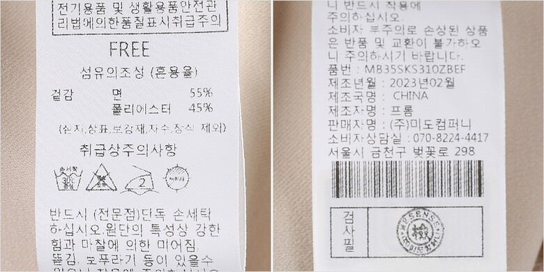 | 1. 제품 소재 (섬유의 조성 또는 혼용률을 백분율로 표시, 기능성인 경우 성적서 또는 허가서) | 겉감-면55% 폴리에스터45% |