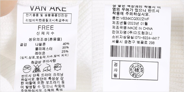 | 1. 제품 소재 (섬유의 조성 또는 혼용률을 백분율로 표시, 기능성인 경우 성적서 또는 허가서) | 겉감-폴리에스터35% 나일론40% 레이온25% |