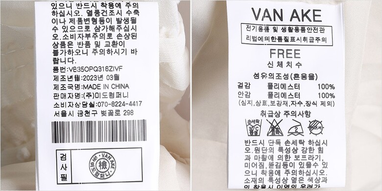 | 1. 제품 소재 (섬유의 조성 또는 혼용률을 백분율로 표시, 기능성인 경우 성적서 또는 허가서) | 겉감-폴리에스터100% 안감-폴리에스터100% |