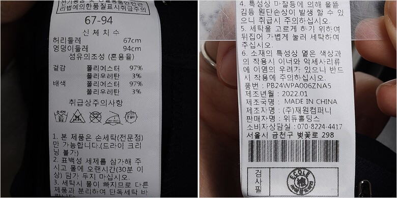 | 1. 제품 소재 (섬유의 조성 또는 혼용률을 백분율로 표시, 기능성인 경우 성적서 또는 허가서) | 겉감-폴리에스터97% 폴리우레탄3% 배색-폴리에스터97% 폴리우레탄3% |