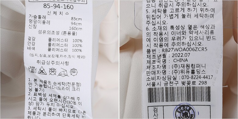 | 6. 세탁방법 및 취급시 주의사항 | 상세페이지 참조 |