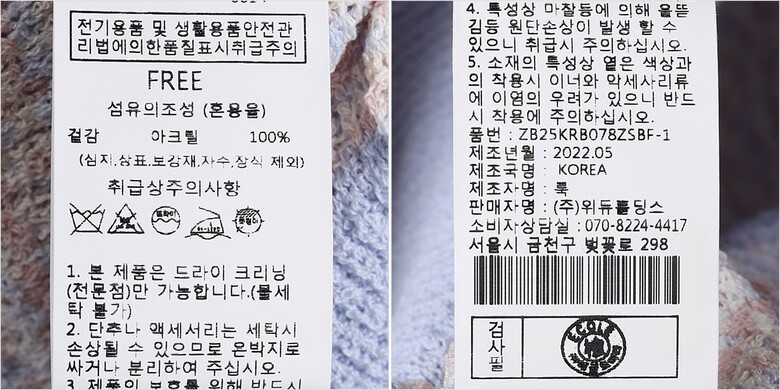 | 1. 제품 소재 (섬유의 조성 또는 혼용률을 백분율로 표시, 기능성인 경우 성적서 또는 허가서) | 겉감-아크릴100% |
