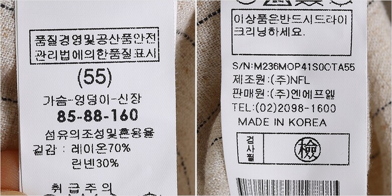 | 1. 제품 소재 (섬유의 조성 또는 혼용률을 백분율로 표시, 기능성인 경우 성적서 또는 허가서) | 겉감-레이온70% 린넨30% |
