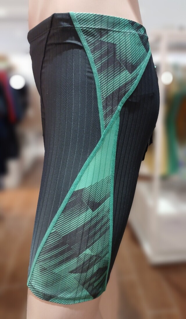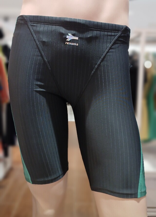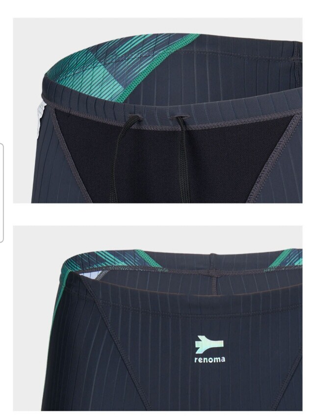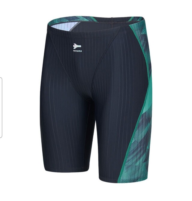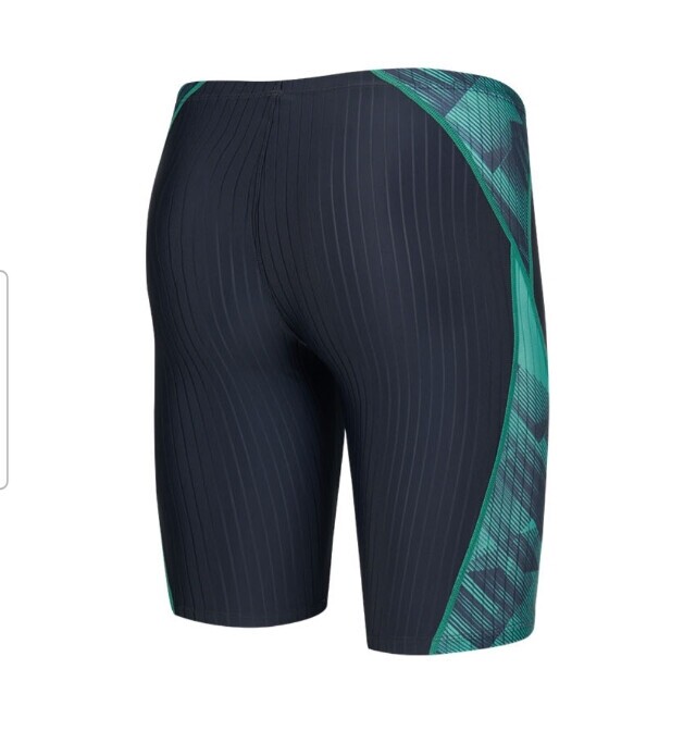 액티브한 기하학 프린트를 사선 배치 오드랄프 라인으로 슬림해 보이며 골지 원단을 사용한 남성 4부 실내수영복입니다.