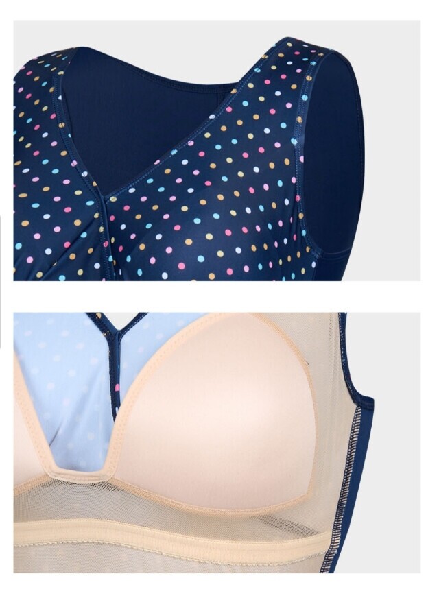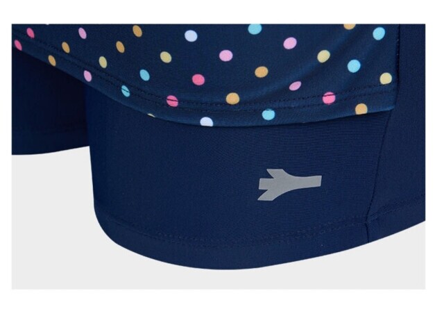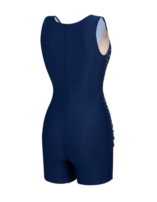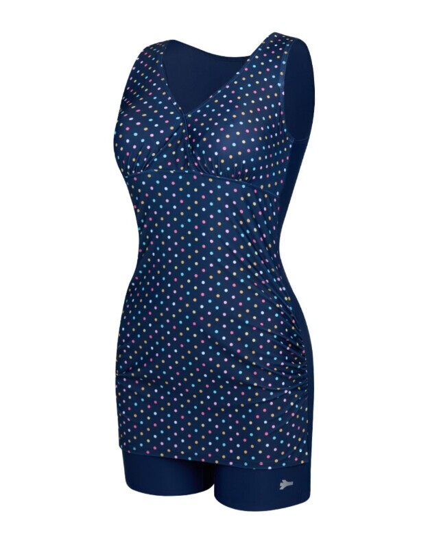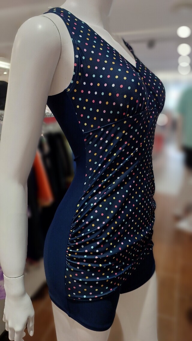 허리 옆선 셔링으로 체형커버에 좋으며 귀여운 도트 프린트의 2.5부 아쿠아아 반신수영복입니다.