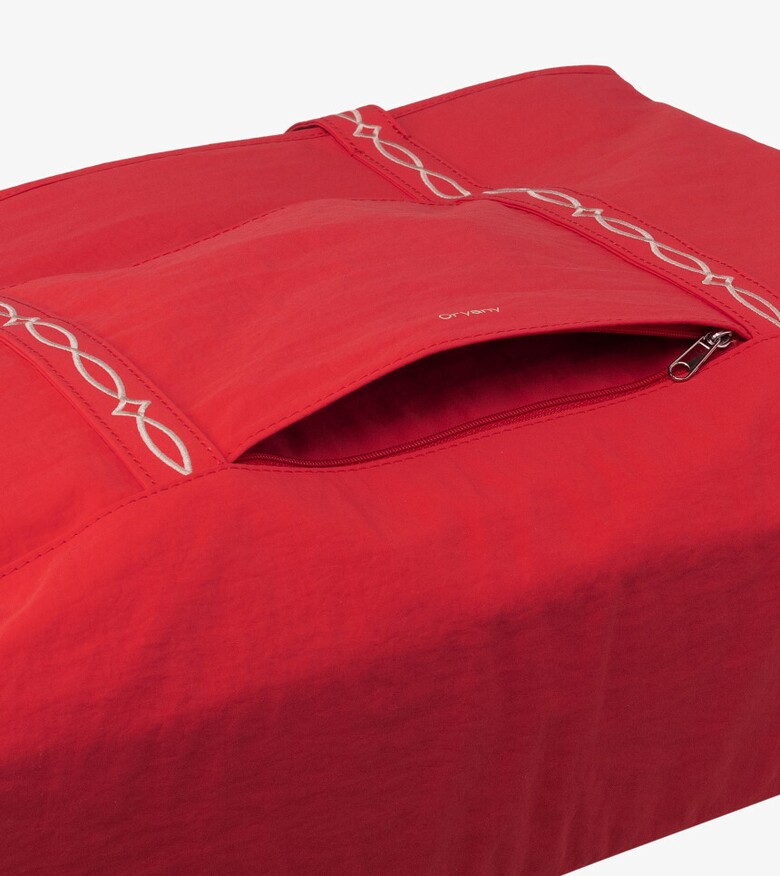 뒷면 오픈 포켓 하단의 지퍼를 열면 캐리어 손잡이에 거치가 가능해 여행 시 활용도가 높은 아이템입니다.