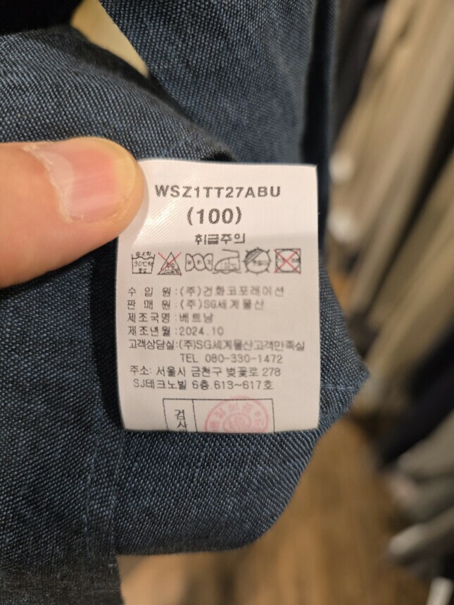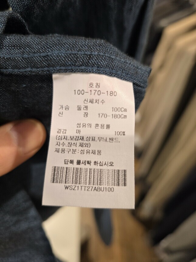 | 1. 제품 소재 (섬유의 조성 또는 혼용률을 백분율로 표시, 기능성인 경우 성적서 또는 허가서) | 겉감 : 마 100% (심지,보강재.상표,무늬,밴드,자수,장식 제외) |