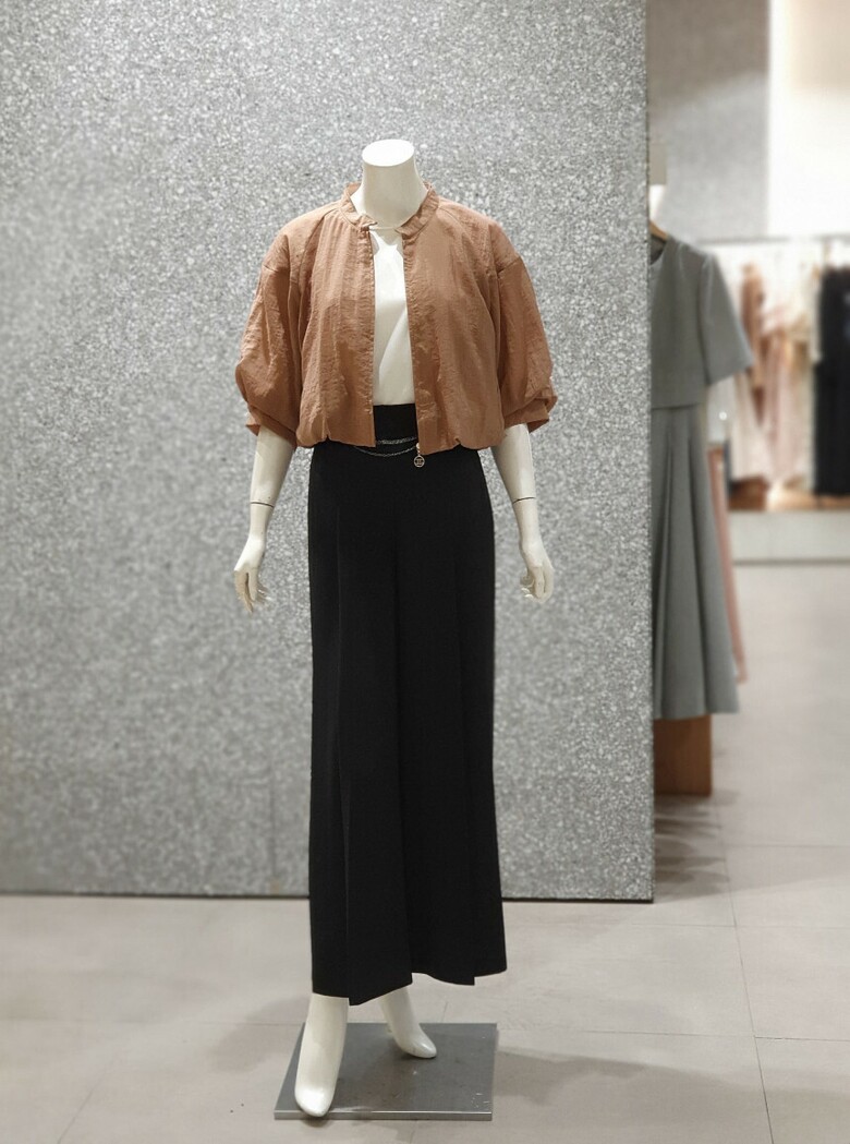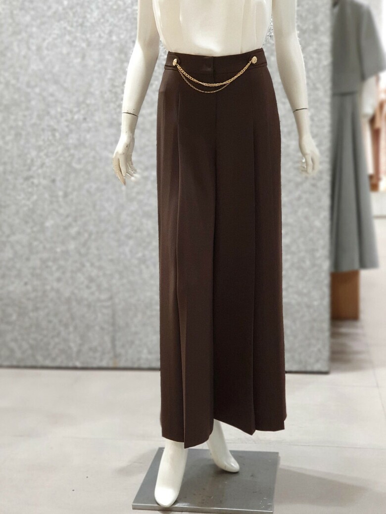 체인 장식과 프런트 더블 핀턱 디테일이 입체감을 살려주어