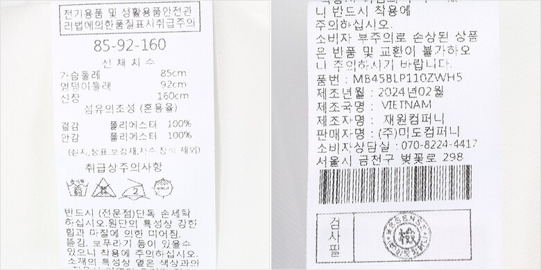 | 1. 제품 소재 (섬유의 조성 또는 혼용률을 백분율로 표시, 기능성인 경우 성적서 또는 허가서) | 겉감-폴리에스터100% 안감-폴리에스터100% |