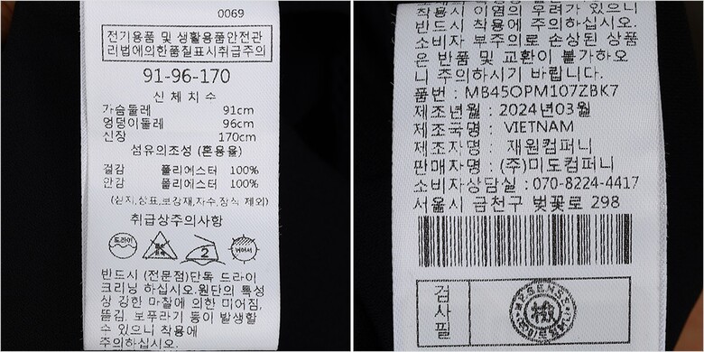 | 1. 제품 소재 (섬유의 조성 또는 혼용률을 백분율로 표시, 기능성인 경우 성적서 또는 허가서) | 겉감-폴리에스터100% 안감-폴리에스터100% |