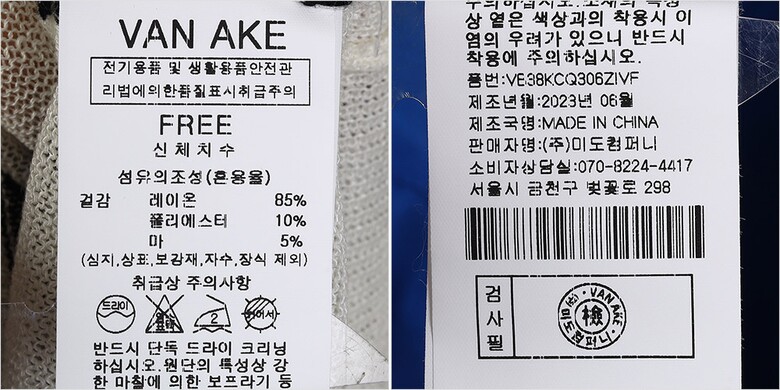 | 1. 제품 소재 (섬유의 조성 또는 혼용률을 백분율로 표시, 기능성인 경우 성적서 또는 허가서) | 겉감-폴리에스터10% 레이온85% 마5% |