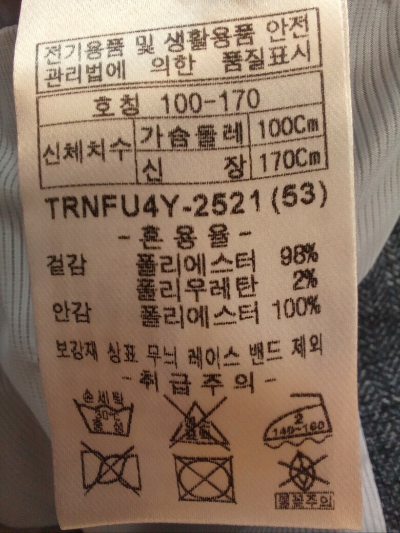 | 1. 제품 소재 (섬유의 조성 또는 혼용률을 백분율로 표시, 기능성인 경우 성적서 또는 허가서) | 겉감:폴리에스테르 98%, 폴리우레탄 2% / 안감:폴리에스테르 100%, |