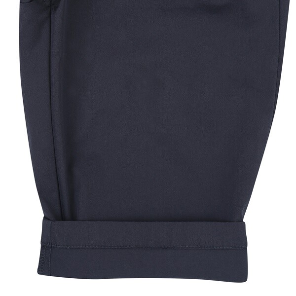 얇고 가벼운 소재로 제안하는 세련된 네이비 컬러의 면스판 소재 7부 기장 배기라인 팬츠입니다.