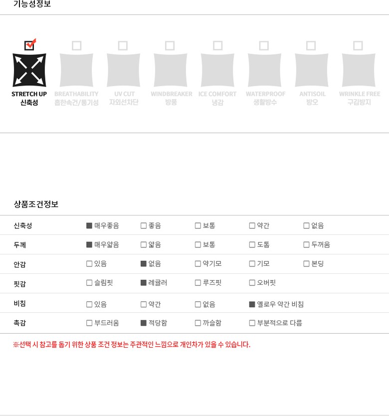 | 1. 제품 소재 (섬유의 조성 또는 혼용률을 백분율로 표시, 기능성인 경우 성적서 또는 허가서) | 상세설명참고 |