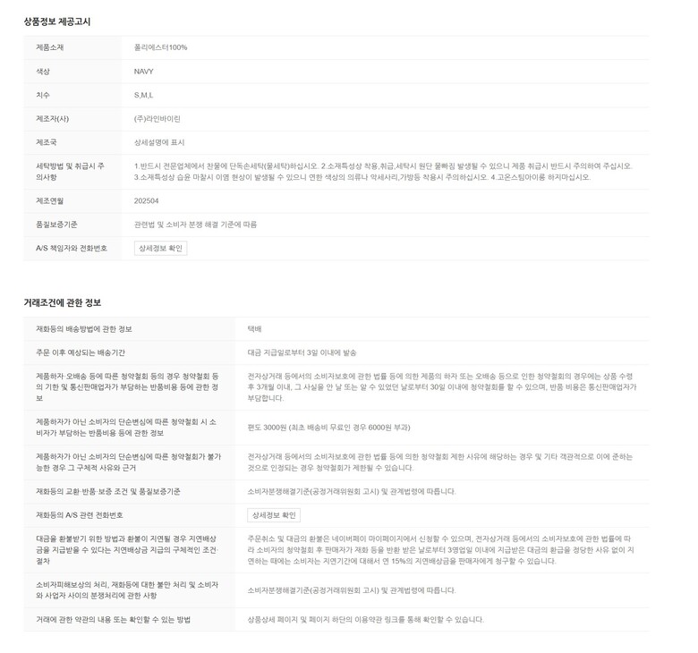 | 6. 세탁방법 및 취급시 주의사항 | 상품상세참조 |