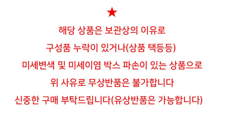 상품불량에 의한 반품, A/S, 품질보증 및 피해보상 등에 관한 사항은 소비자 분쟁해결기준(공정거래위원회 고시) 구매자가 미성년자인 경우에는 상품 구입시 법정대리인이 동의하지 아니하면 미성년자 본인 또는 법정대리인이 구매취소 할 수 있습니다. |