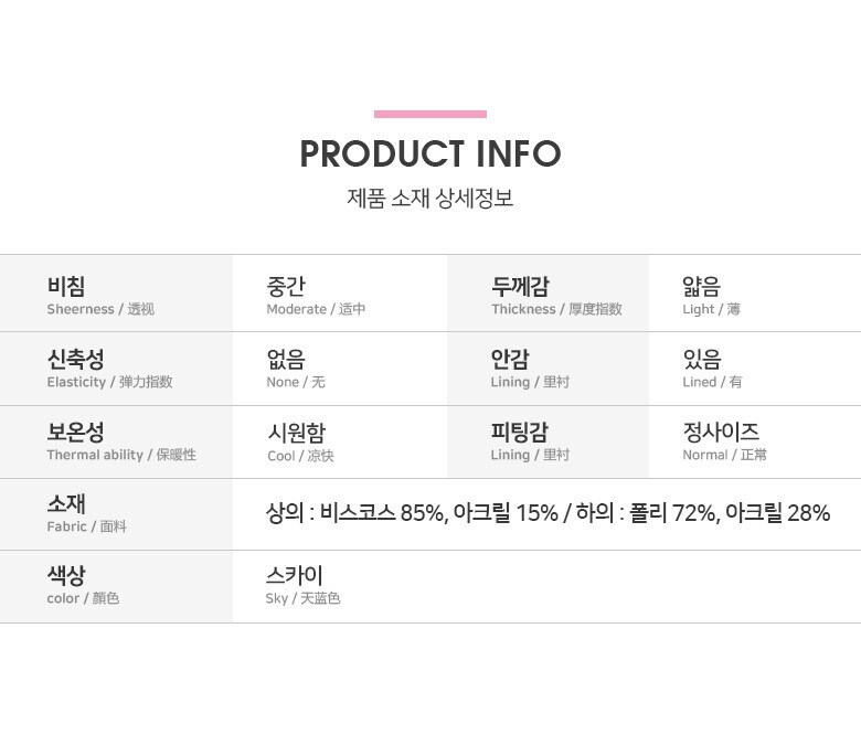 | 1. 제품 소재 (섬유의 조성 또는 혼용률을 백분율로 표시, 기능성인 경우 성적서 또는 허가서) | 별도표시 |