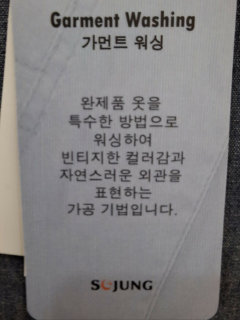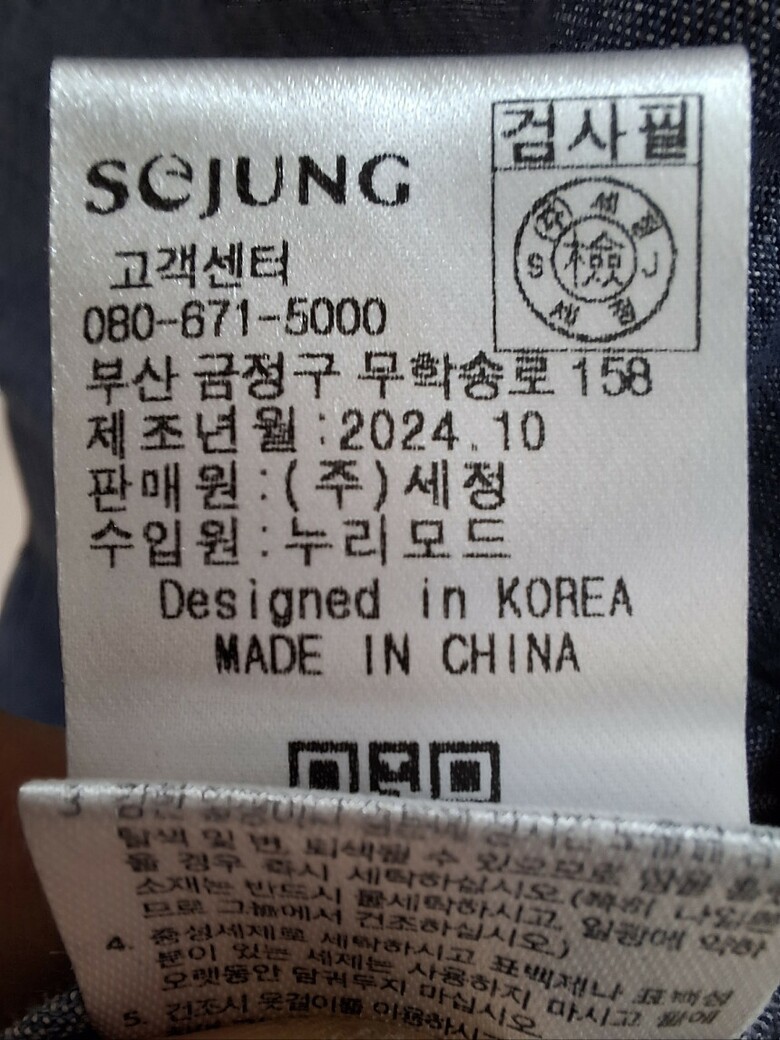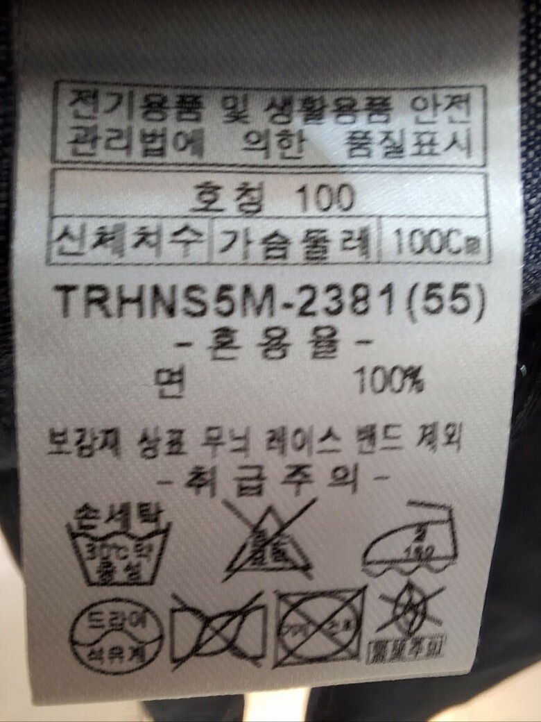 | 1. 제품 소재 (섬유의 조성 또는 혼용률을 백분율로 표시, 기능성인 경우 성적서 또는 허가서) | 데님, 면 100% |
