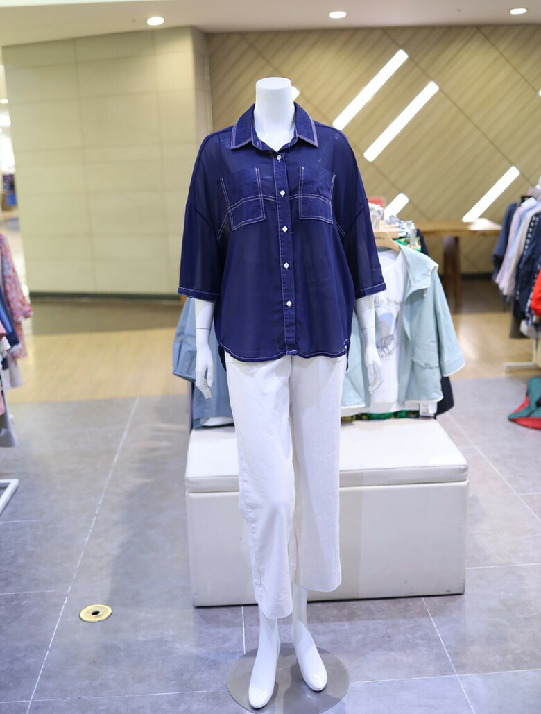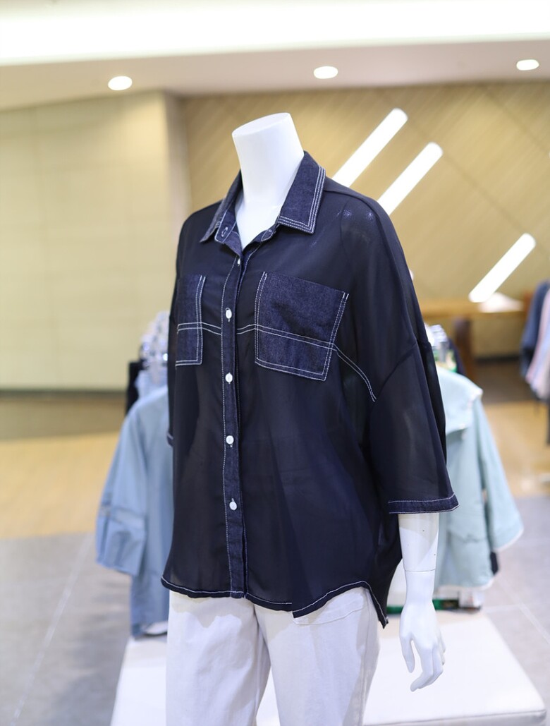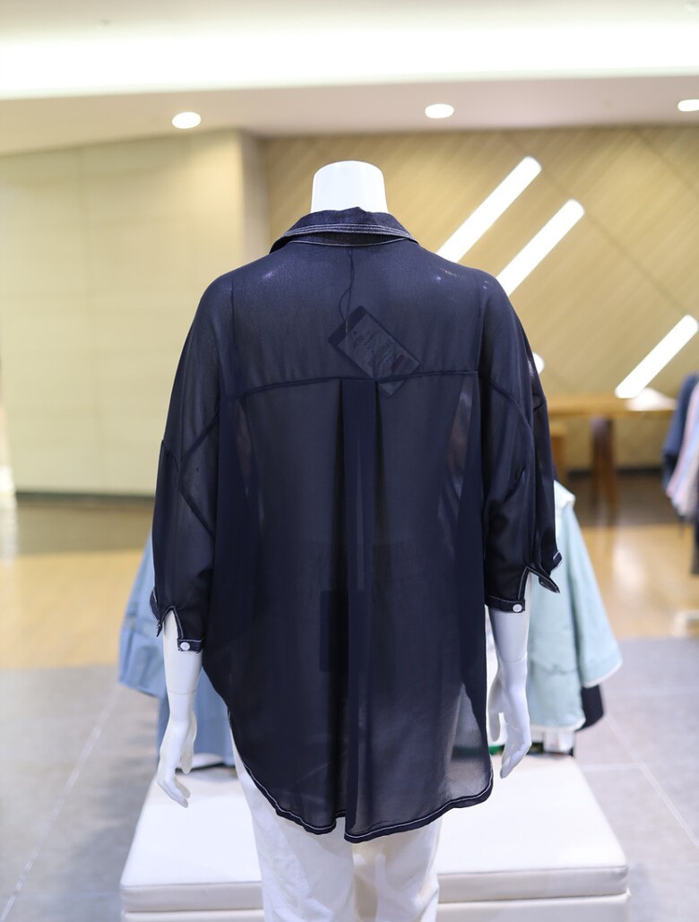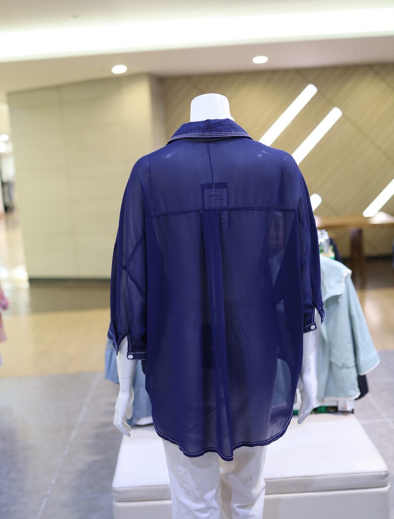 시스루한 소재와 데님 배색으로 유니크하면서도