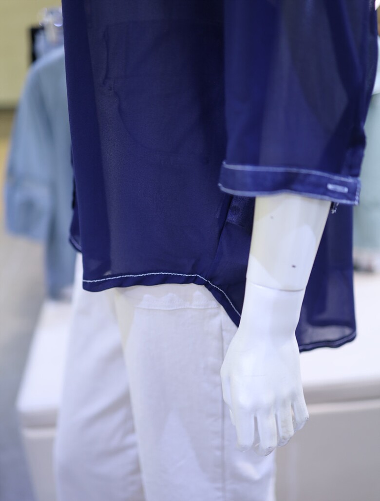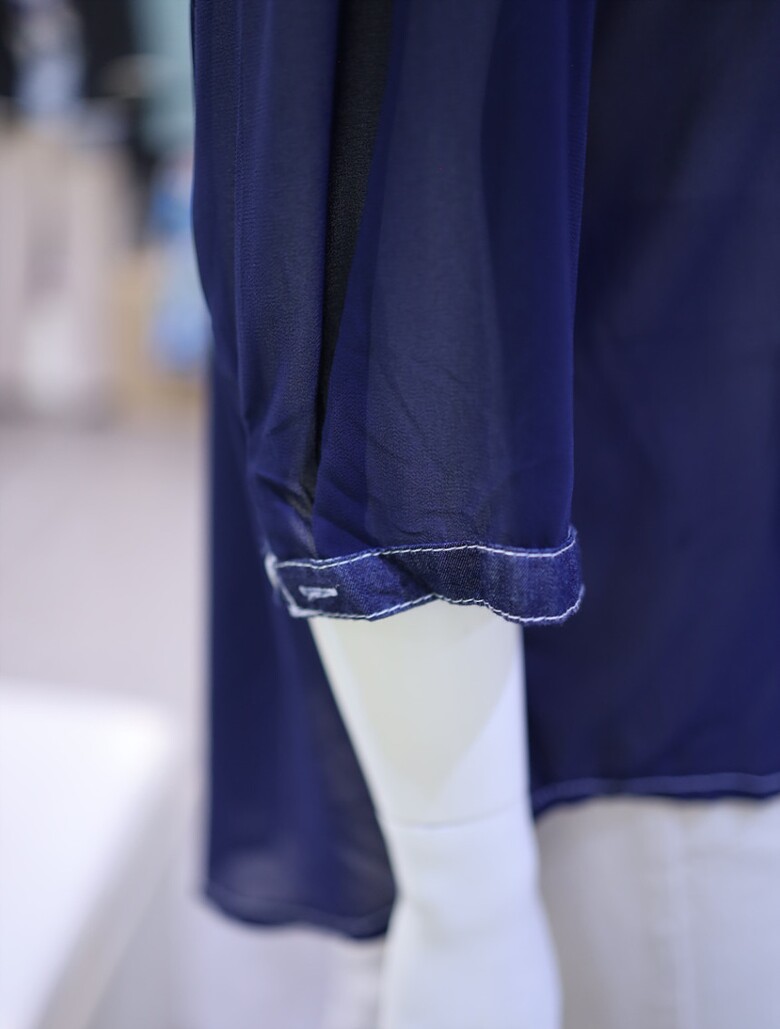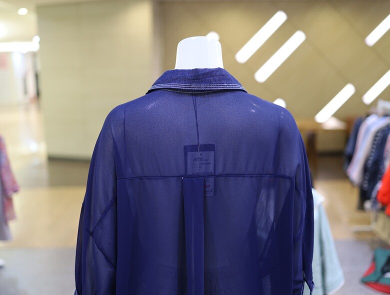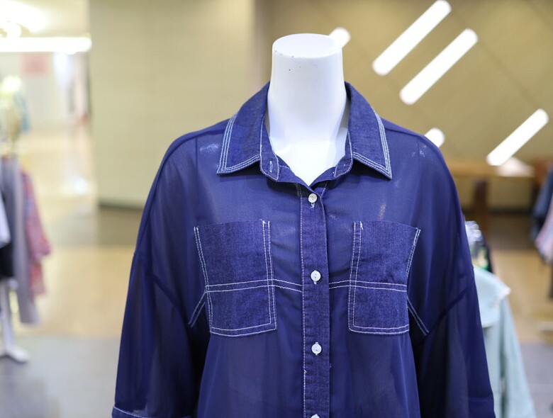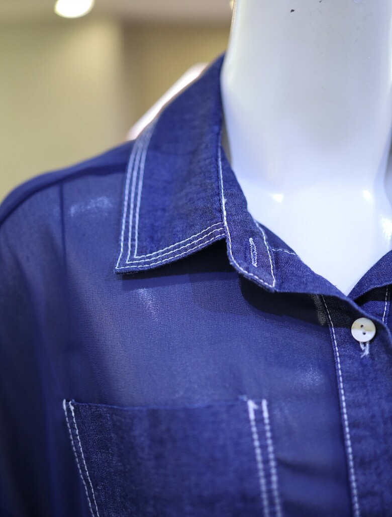 시스루한 소재와 데님 배색으로 유니크하면서도