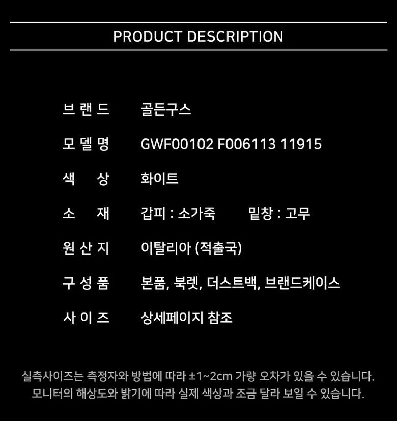 | 1. 제품 소재 (운동화인 경우에는 겉감, 안감을 구분하여 표시) | 상세페이지 참조 |