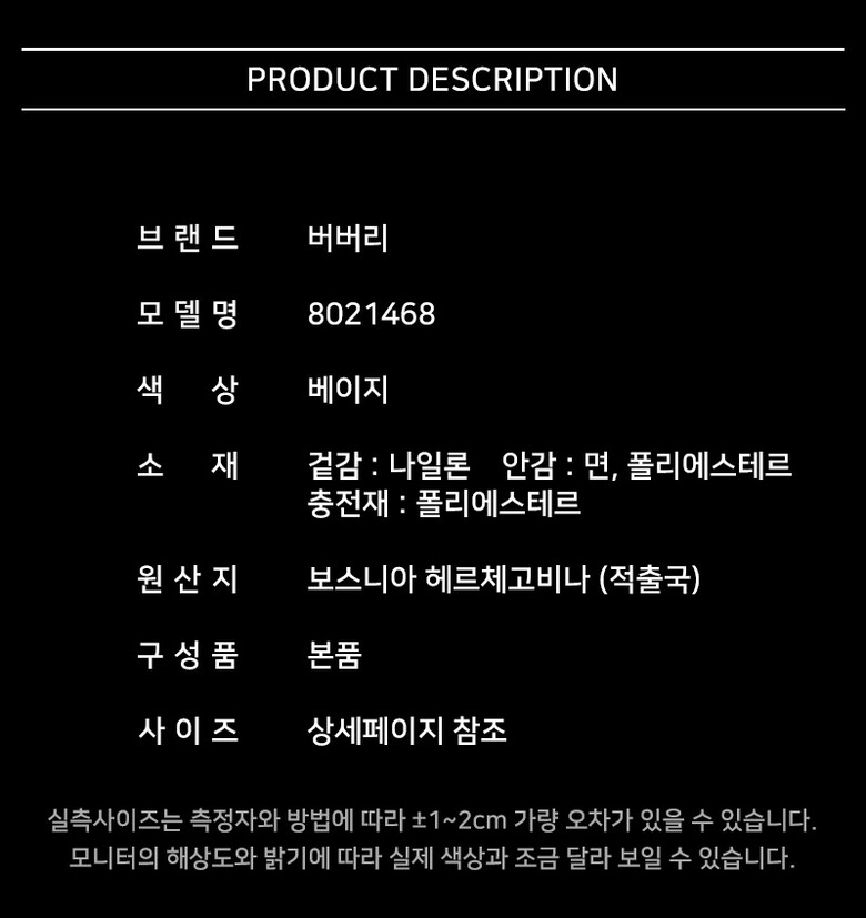 | 1. 제품 소재 (섬유의 조성 또는 혼용률을 백분율로 표시, 기능성인 경우 성적서 또는 허가서) | 상세페이지 참조 |