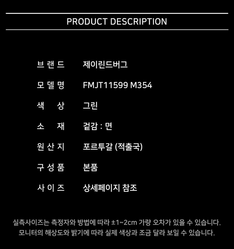| 1. 제품 소재 (섬유의 조성 또는 혼용률을 백분율로 표시, 기능성인 경우 성적서 또는 허가서) | 상세페이지 참조 |