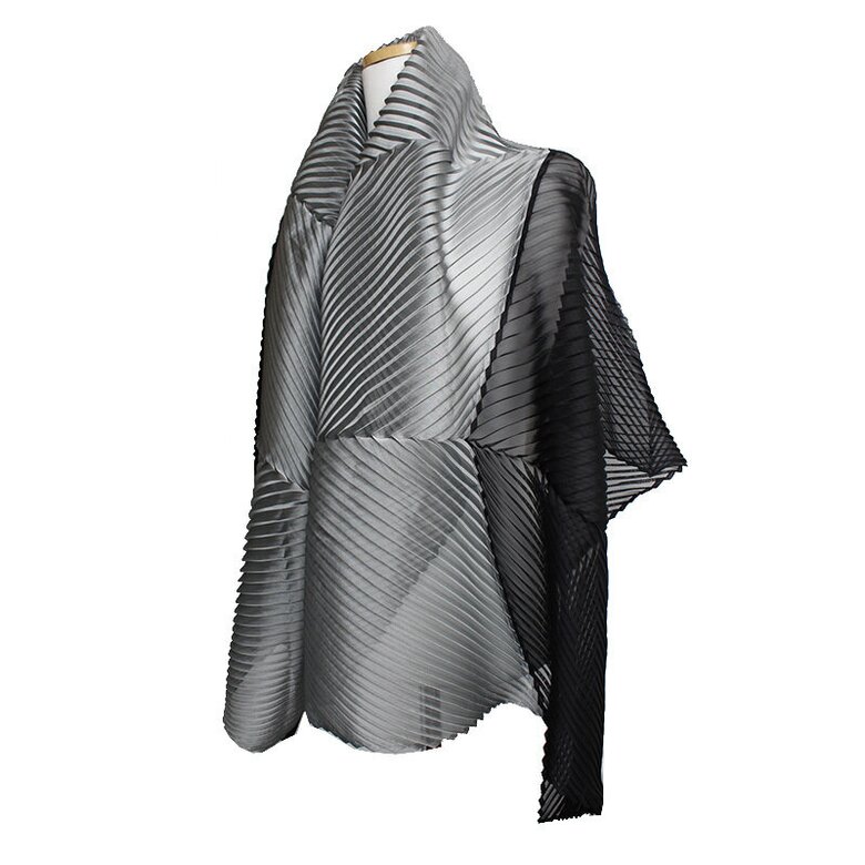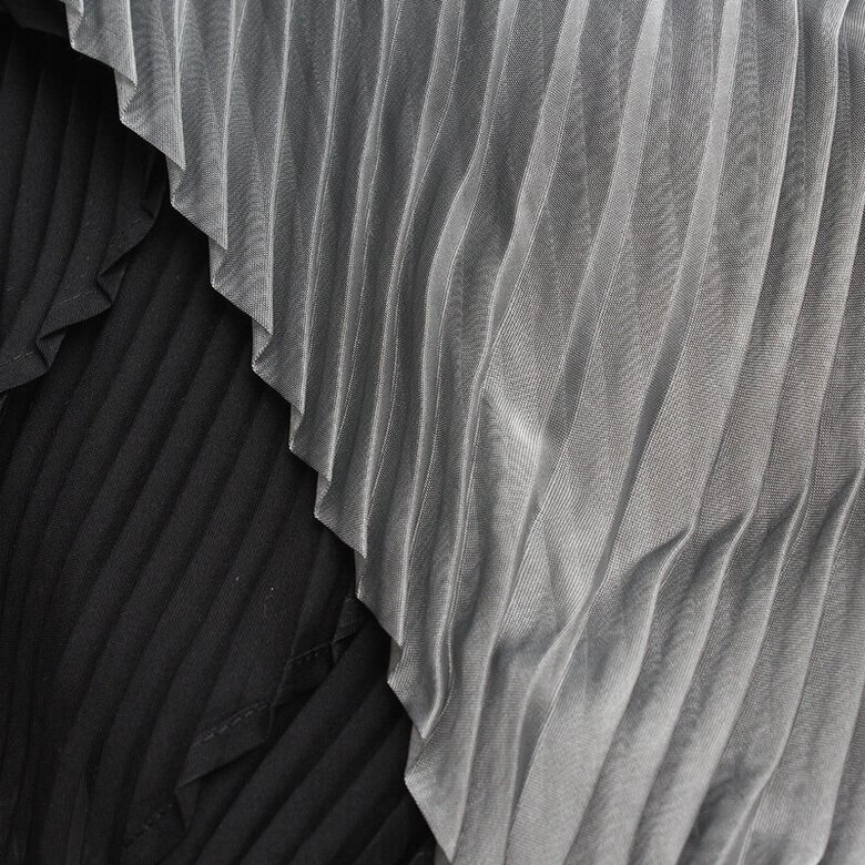 블랙과 그레이의 세련된 조화와 다채롭게 스타일링 가능한 풍성한 플리츠 소재감이
