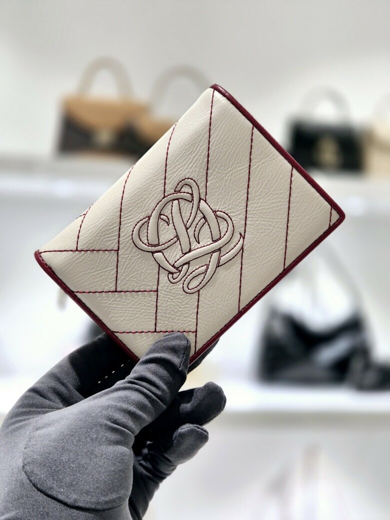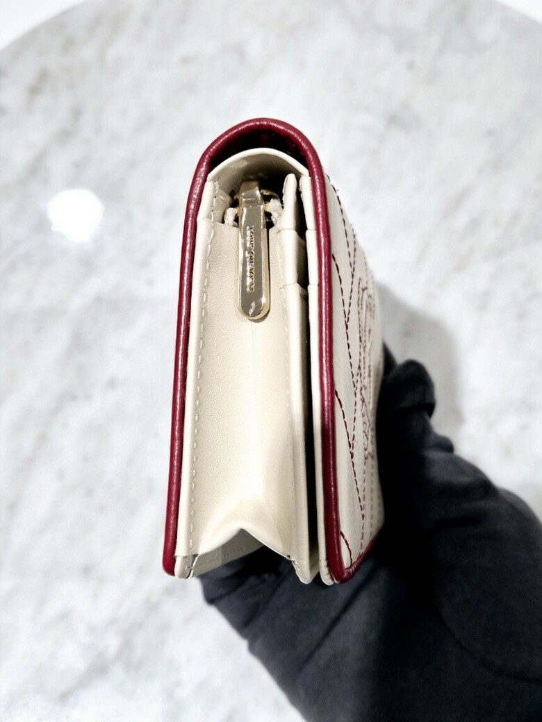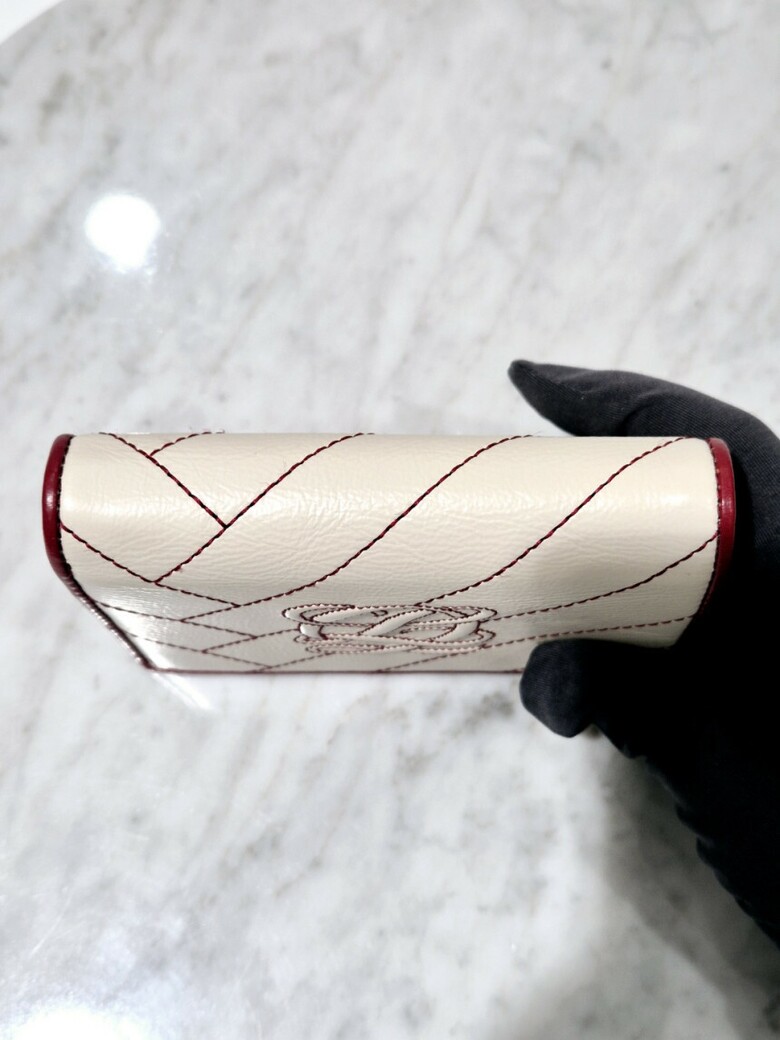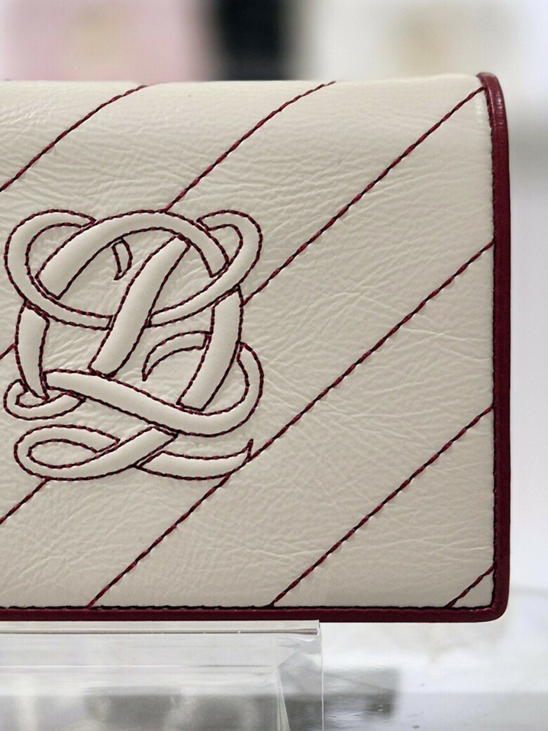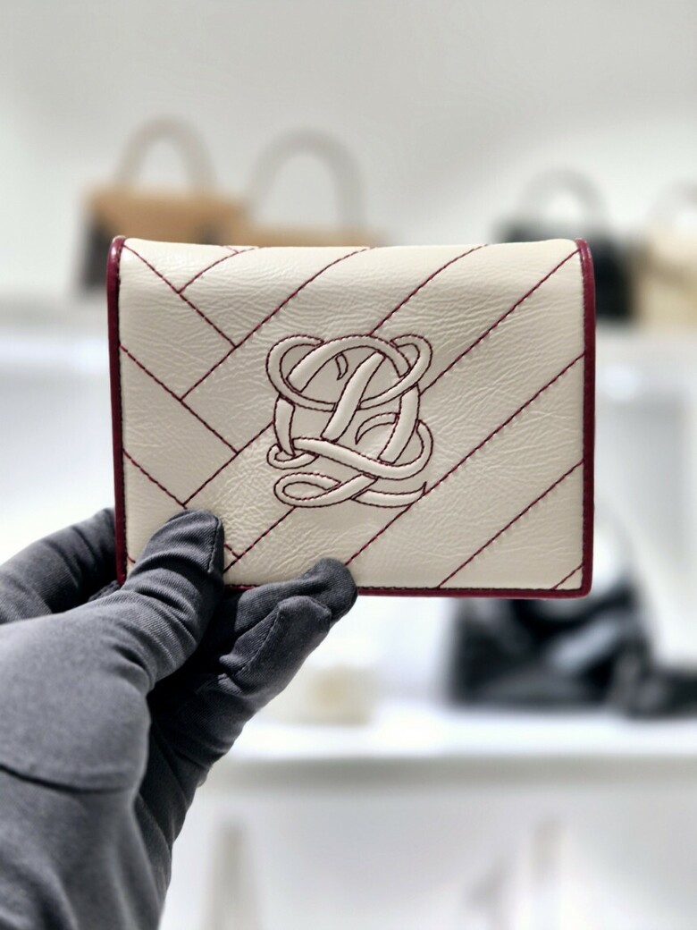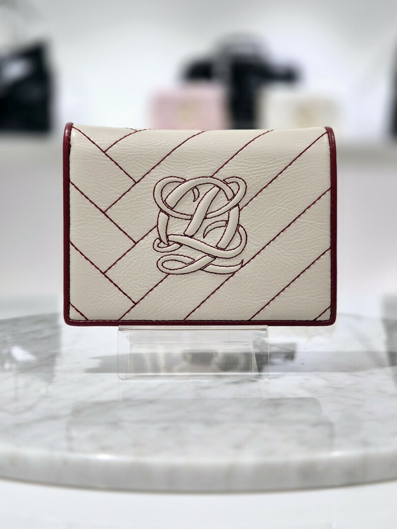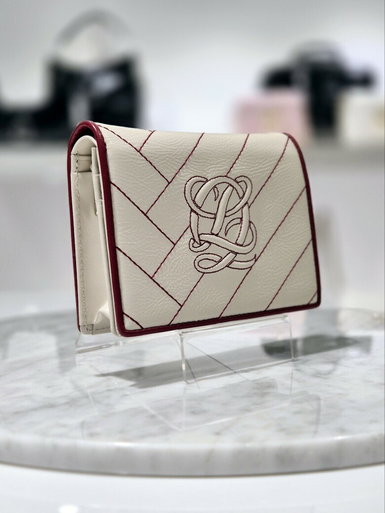 볼륨감 있는 심볼 자수가 포인트 되는 페미닌 무드의 크랙 소재 반지갑.