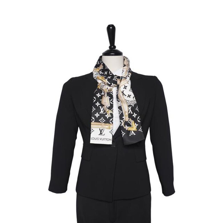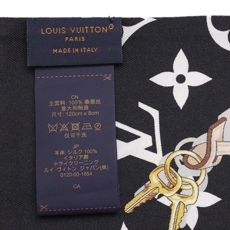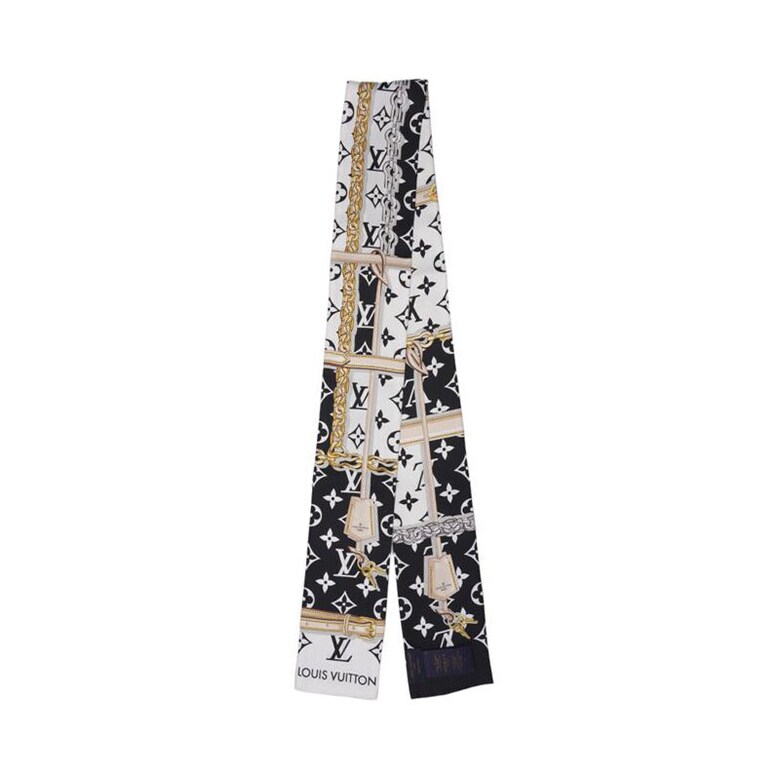 - 상징적인 모노그램 패턴 위에 가죽 스트랩, 금속 체인, 자물쇠와 같은 루이비통을 대표하는 부속 디테일을 프린트한 실크 방도 - 목 또는 머리에 두르거나 루이 비통 백의 핸들에 장식할 수 있는 스타일리시한 액세서리 - 실크 트윌 100% - 잉크젯 프린트 - 드라이클리닝만 가능
