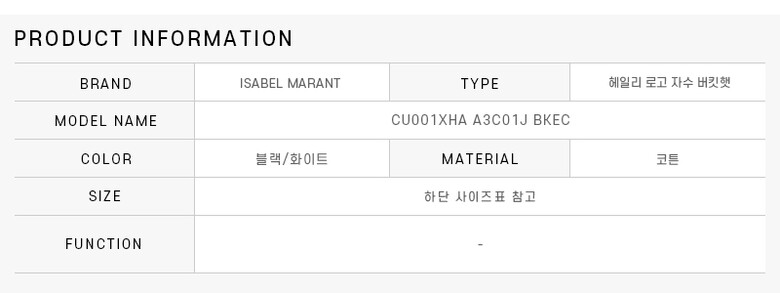 - #리본즈코리아 #CU001XHAA3C01JBKEC #[명품] #이자벨마랑 #CU001XHA #A3C01J #BKEC #HALEY #헤일리 #로고 #자수 #버킷햇 #여성 #패션잡화 #모자 #버킷햇벙거지