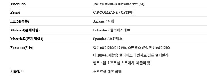| 1. 제품 소재 (섬유의 조성 또는 혼용률을 백분율로 표시, 기능성인 경우 성적서 또는 허가서) | 상세페이지 참조 |