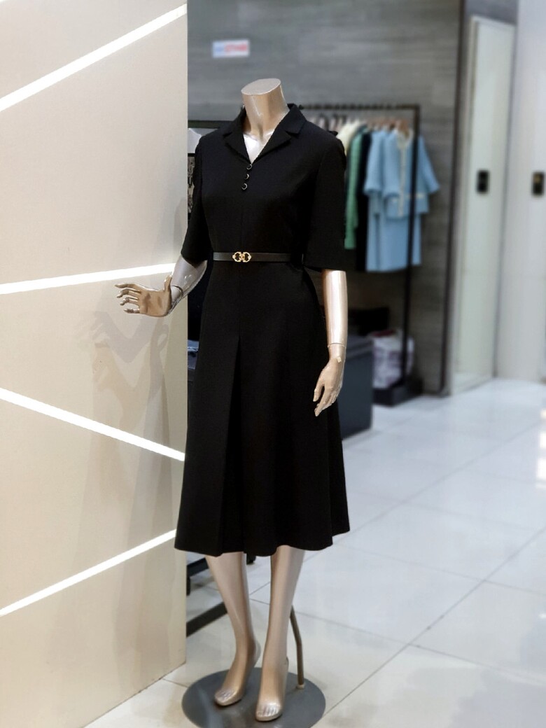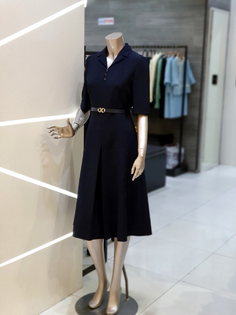 프런트 버튼 장식과 스커트 핀턱으로 입체감을