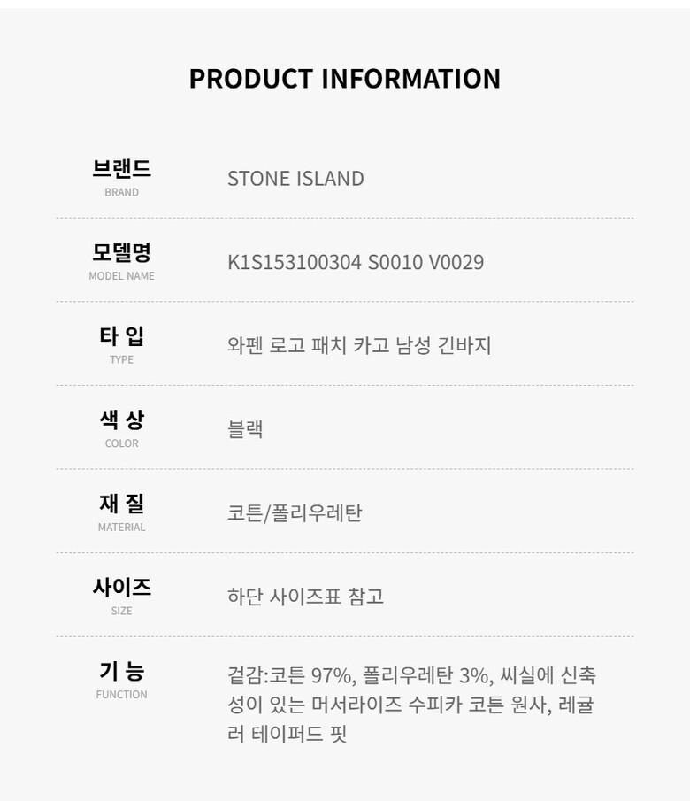 스톤아일랜드 바지 K1S153100304 S0010 V0029 와펜 로고 패치 남성바지 당일발송