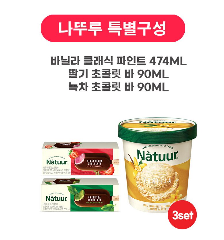 [나뚜루] 파인트 1개+바 2개 세트 (바닐라 파인트/딸기초콜 바/녹차초콜 바)