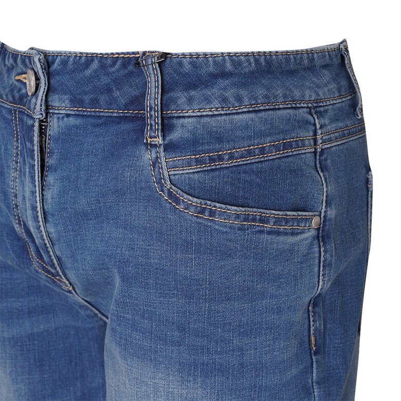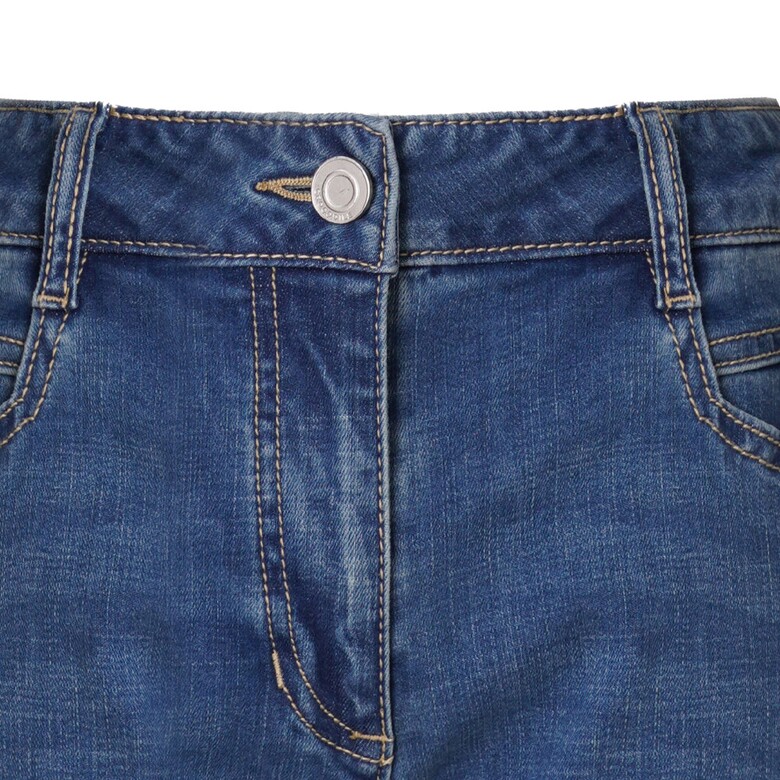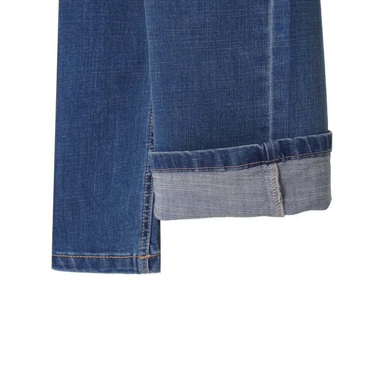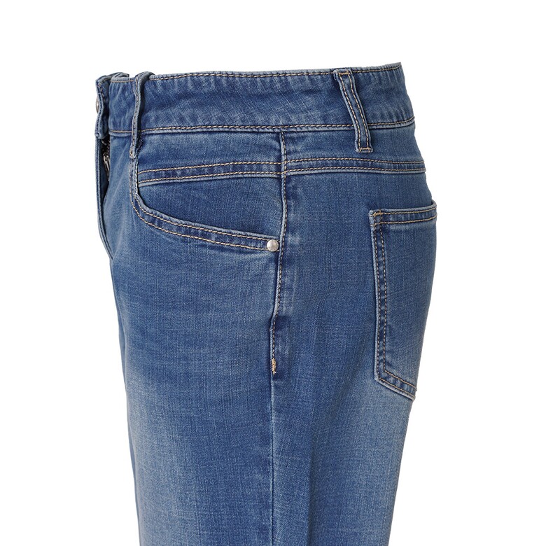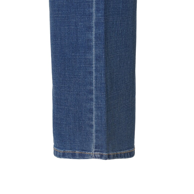 부츠컷으로 떨어지는 실루엣의 데님 팬츠. 배색 스티치와 택션지 포인트로 여성스러움을 한층 더해줌.