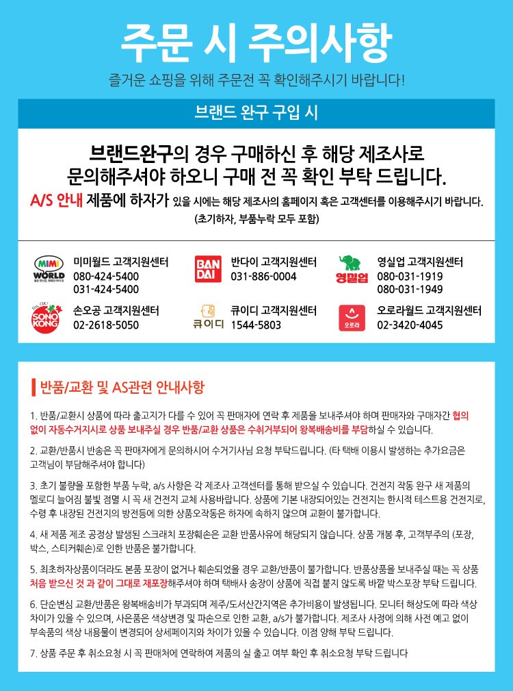 상품불량에 의한 반품, A/S, 품질보증 및 피해보상 등에 관한 사항은 소비자 분쟁해결기준(공정거래위원회 고시) 구매자가 미성년자인 경우에는 상품 구입시 법정대리인이 동의하지 아니하면 미성년자 본인 또는 법정대리인이 구매취소 할 수 있습니다. |