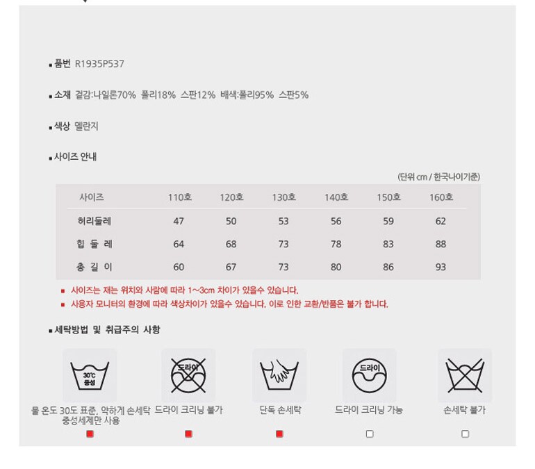 | 1. 제품 소재 (섬유의 조성 또는 혼용률을 백분율로 표시, 기능성인 경우 성적서 또는 허가서) | 겉감:나일론70% 폴리18% 스판12% 배색:폴리95% 스판5% |
