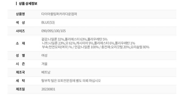 | 1. 제품 소재 (섬유의 조성 또는 혼용률을 백분율로 표시, 기능성인 경우 성적서 또는 허가서) | 상품상세참조 |