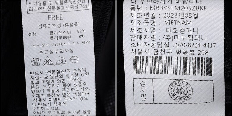 | 1. 제품 소재 (섬유의 조성 또는 혼용률을 백분율로 표시, 기능성인 경우 성적서 또는 허가서) | 겉감-폴리에스터92% 폴리우레탄8% |
