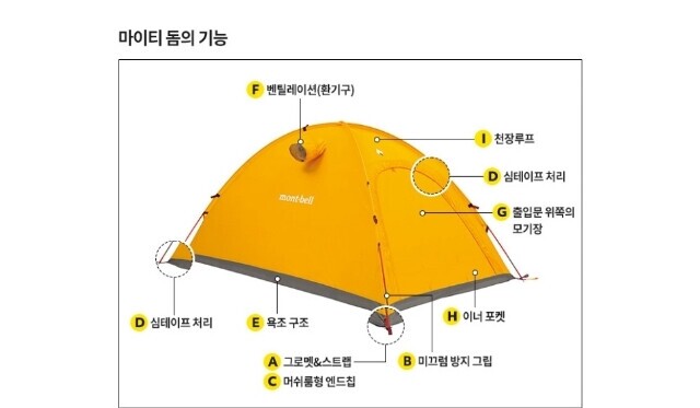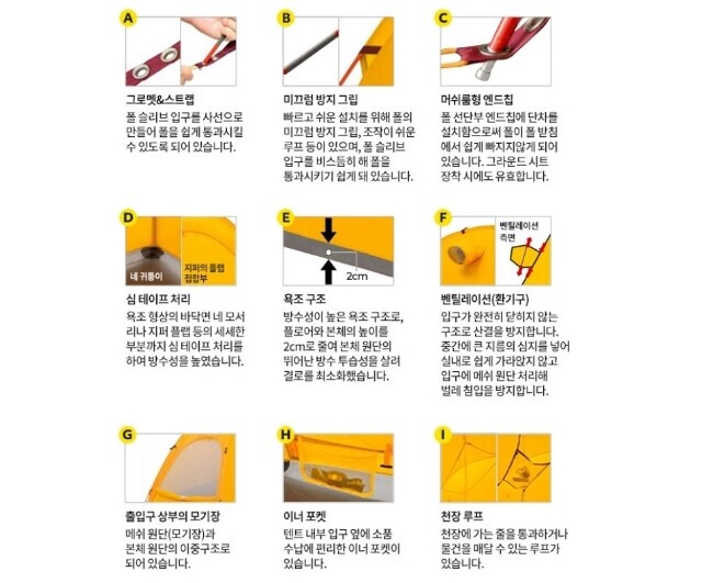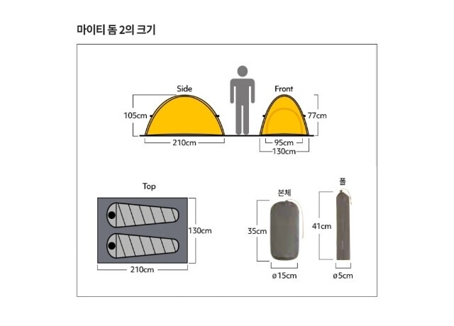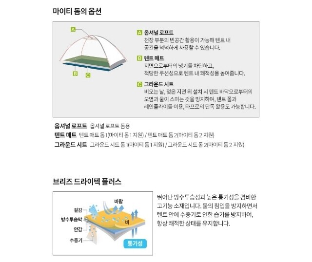 | 1. 제품소재 | 본체 브리즈 드라이 테크 플러스 3레이어 [PTFE라미네이트 가공][겉감 15데니어 바리스틱 나일론 립스탑 (내수압 20,000mm)] 플러스 30데니어 바리스틱 나일론 립스탑 (내수압 1,500mm,우레탄 코팅) 폴 알루미늄 합금(폴 지름)8.5mm |
