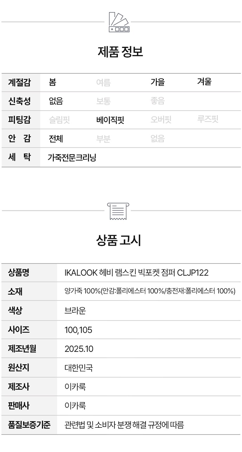| 1. 제품 소재 (섬유의 조성 또는 혼용률을 백분율로 표시, 기능성인 경우 성적서 또는 허가서) | 양가죽 100%(안감:폴리에스터 100%/충전재:폴리에스터 100%) |